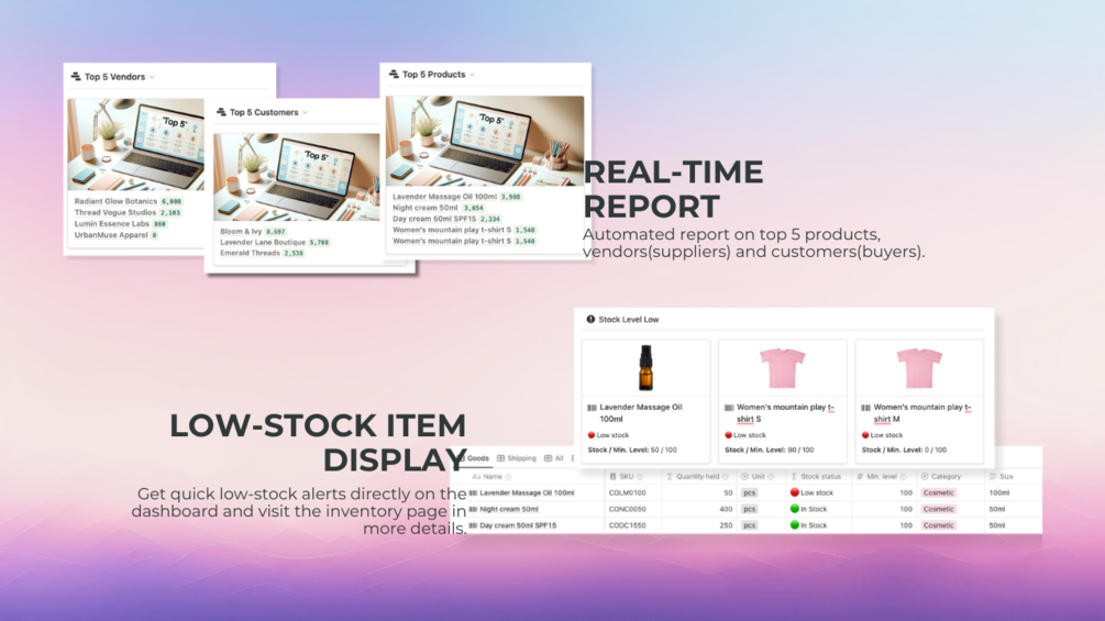 - Automated report on top 5 products, vendors(suppliers) and customers(buyers)