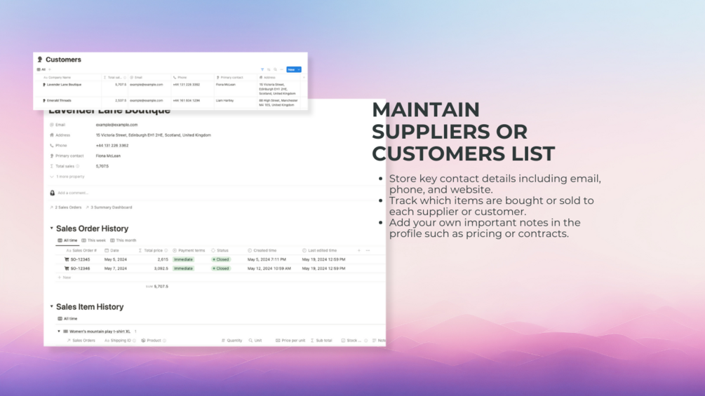Keep track of stock quantities, manage incoming and outgoing inventory, set up low stock alerts, and maintain a comprehensive vendor or customer database.